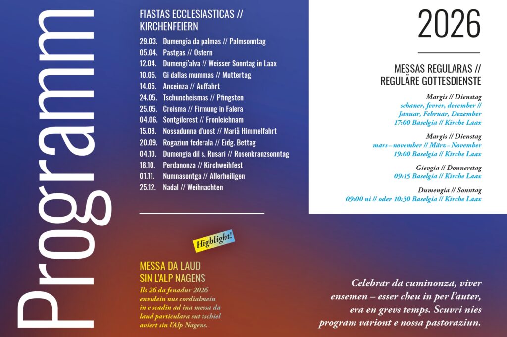 El flyer cun il program digl onn dalla pleiv Laax anfleis Vus impurtonts termins ed informaziuns pigl onn 2026.
